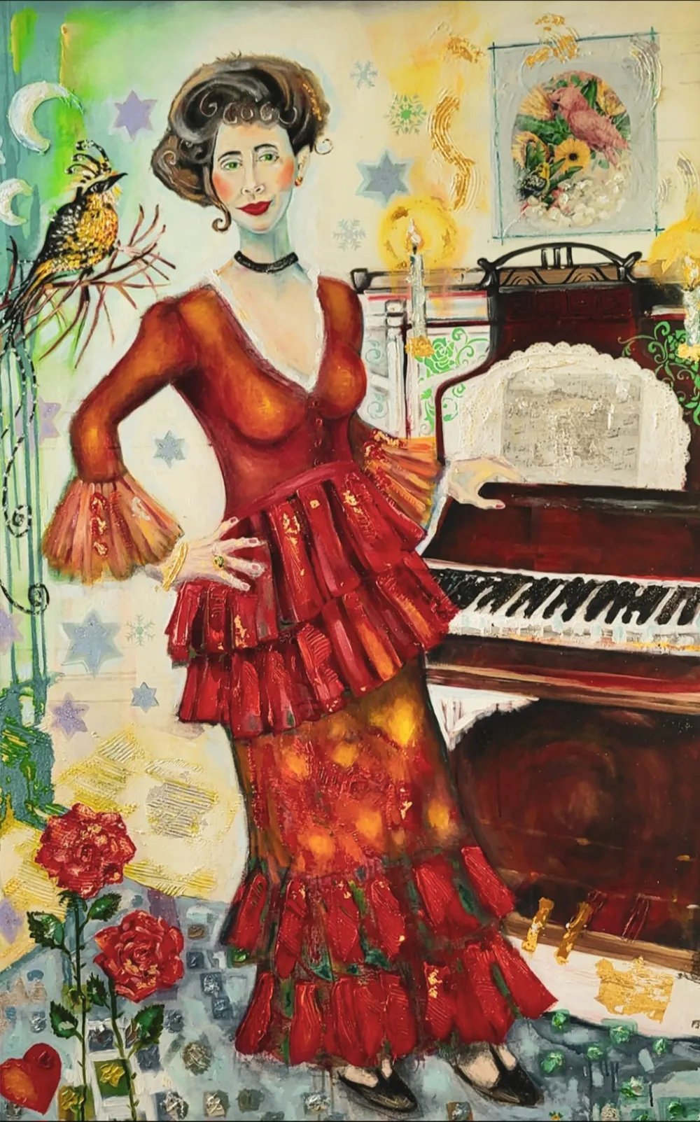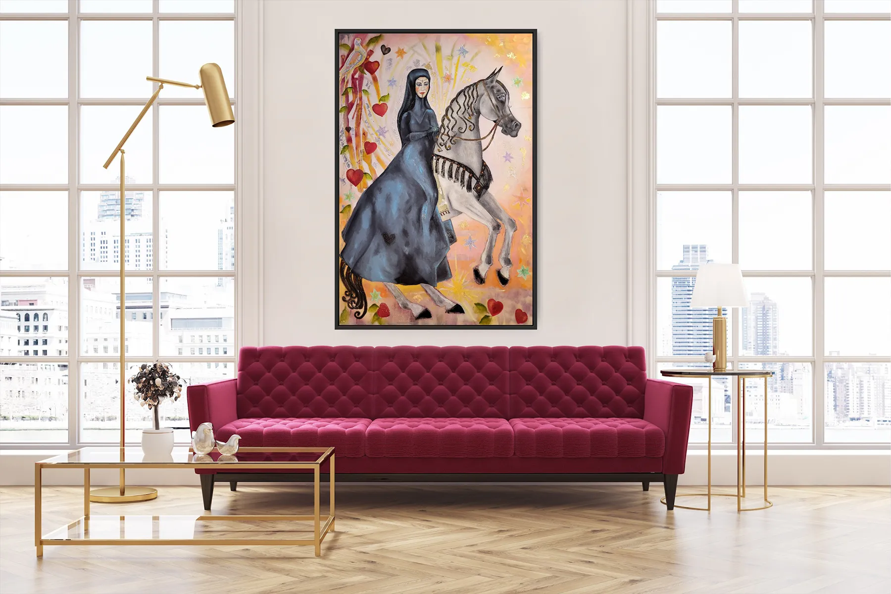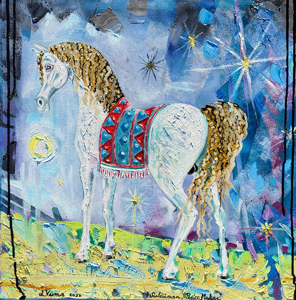 Viima’s creative process is intuitive and spiritually driven. Ideas emerge continuously in her mind, urging her toward the canvas. She begins each piece by laying down a foundation of acrylic paint, breaking the blank surface before moving into rich, layered applications of oil. Her technical method includes multiple layers—often two to five—that incorporate gypsum, stencils, mica pigments, and resin. The artist sees her process as a sacred dialogue, a divine gift she feels compelled to honour through every brushstroke.